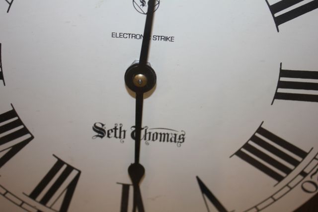 Electronic Strike Seth Thomas battery operated mantel clock, 16"w., 28"h. Electronic Strike Seth Thomas battery operated mantel clock, 16"w., 28"h.