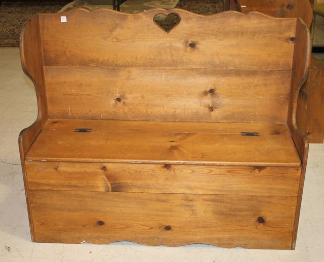 Primitive Style Pine Settee with lift up seat, 48"w., 17"d., 40"h. Primitive Style Pine Settee with lift up seat, 48"w., 17"d., 40"h.