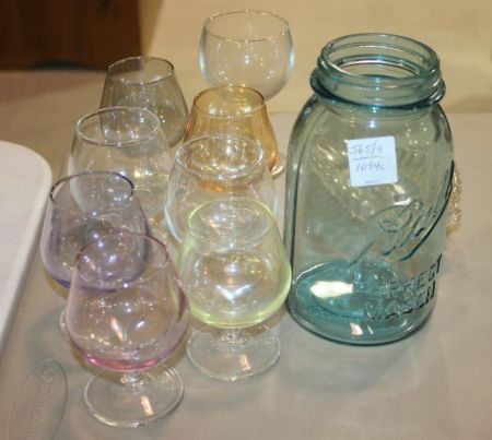 565 Seven Cordials and Dish Seven cordials, oval dish, and Ball Mason jar.