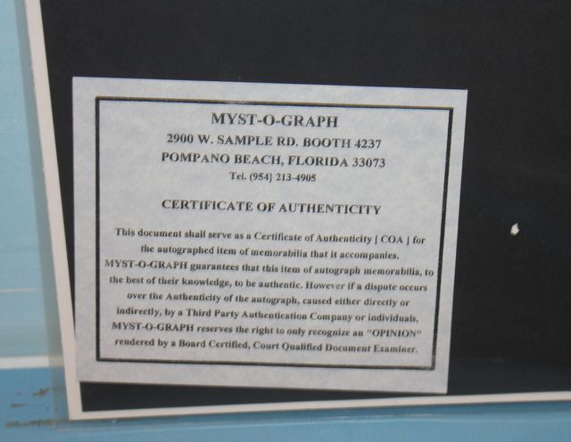 637 Troy Stradford Autograph Myst-O-Graph, Certificate of Authenticity, 5" x 7".