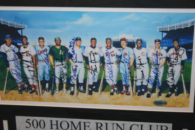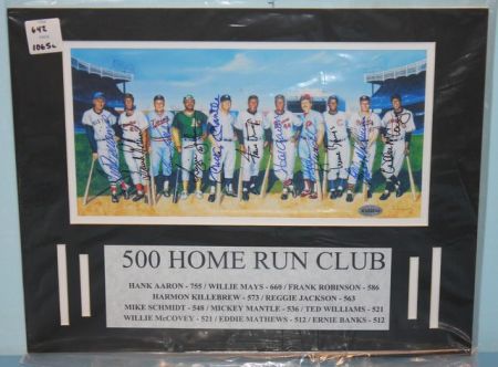 500 Home Run Club Autographs Hank Aaron-755/ Willie Mays-660/ Frank Robinson-586/ Harmon Killebrew-573/ Reggie Jackson-563/ Mike Schmidt-548/ Mickey Mantle-536/ Ted Williams-521/ Willie McCovey-521/ Eddie Mathews-512/ Ernie Banks-512. Serial: A22534, YMC Sports Certificate of Authenticity, 11" x 14". 500 Home Run Club Autographs Hank Aaron-755/ Willie Mays-660/ Frank Robinson-586/ Harmon Killebrew-573/ Reggie Jackson-563/ Mike Schmidt-548/ Mickey Mantle-536/ Ted Williams-521/ Willie McCovey-521/ Eddie Mathews-512/ Ernie Banks-512. Serial: A22534, YMC Sports Certificate of Authenticity, 11" x 14".