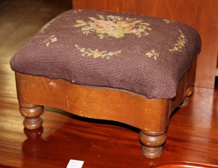 Small Mahogany Empire Needlepoint Foot Stool 7"h., 12"w., 10"d. Small Mahogany Empire Needlepoint Foot Stool 7"h., 12"w., 10"d.