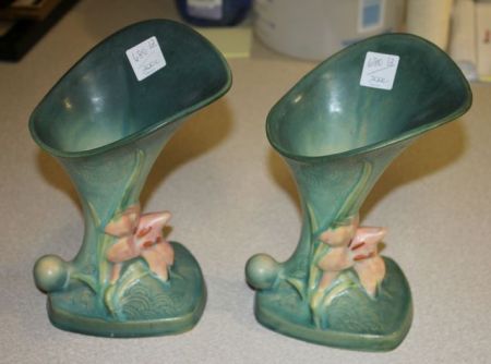 680 Pair of Zepher Lily Roseville Cornucopia Vases numbered: 204-8., 8"h.