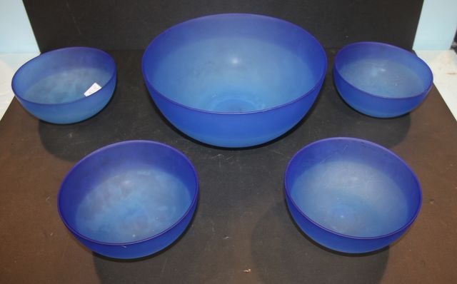 156 Large Blue Glass Pottery Barn Bowl and Four Salad Bowls 9"dia.