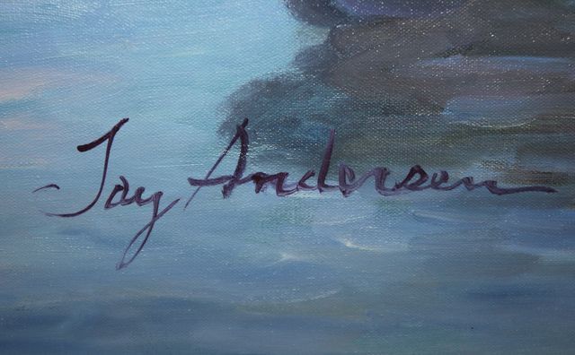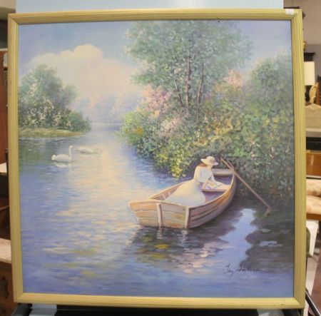 161 Oil Painting on Board of Lady Reading in a Boat signed Jay Anderson, 38"w., 39"h.