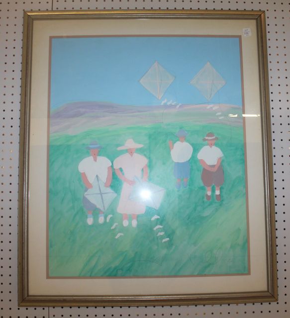 Watercolor of Kite Flyers signed Hill '86 30"w., 37"h. Watercolor of Kite Flyers signed Hill '86 30"w., 37"h.