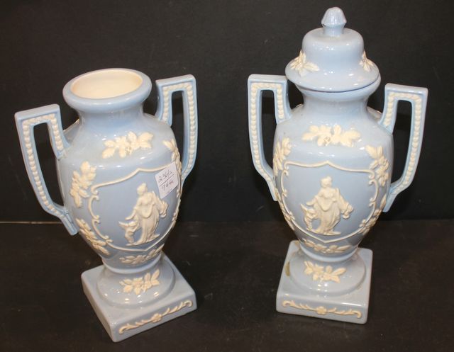 236 Pair of Ceramic Wedgwood Style Urns one lid missing, 11"h.