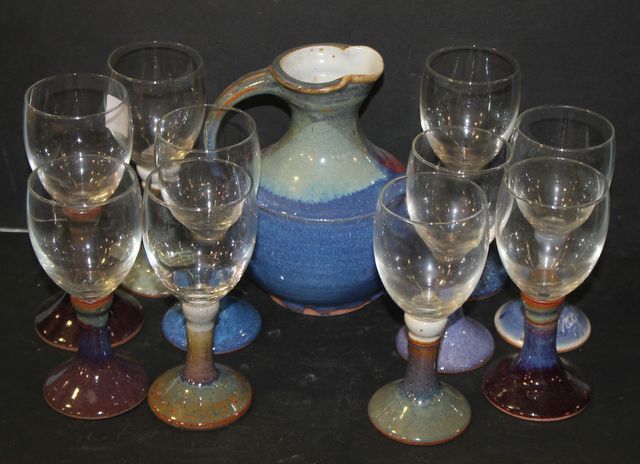 379 Pottery Pitcher with Ten Glass/Pottery Glasses