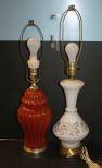 438 White Glass Lamp with Gold Decoration and Orange Lamp 28"h.