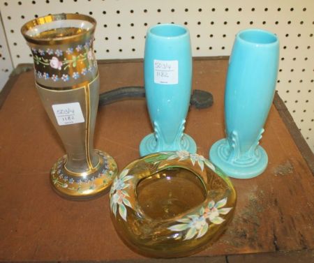 503 Two Aqua Fiesta Vases, Painted Decorated Vase, Matching ashtray vases 6"h.