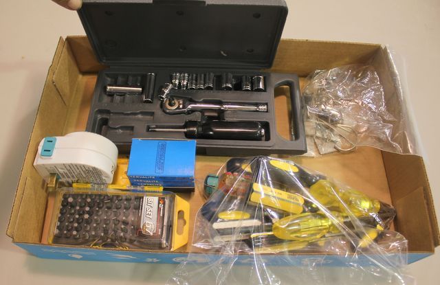 Box Lot of Screwdrivers, Bit Set, Ratchet Set, Hooks, and Timer Box Lot of Screwdrivers, Bit Set, Ratchet Set, Hooks, and Timer