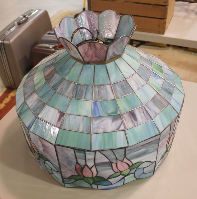 630 Stain Glass Hanging Lamp some panels broken and repaired, 20"dia., 16"h.
