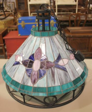 631 Iron Frame with Stain Glass Fixture Some Panels broken and repaired, 23"dia., 20"h.