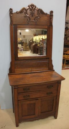 Oak Washstand with Gingerbread Carved Mirror 33" w., 75" h., 18" d. Oak Washstand with Gingerbread Carved Mirror 33" w., 75" h., 18" d.