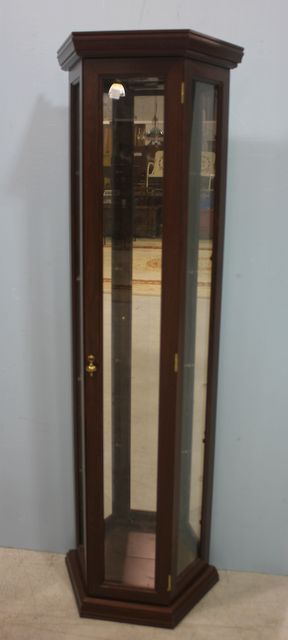 Mahogany Lighted Display Cabinet Has mirrored back and glass shelves; 22" w., 70" h. Mahogany Lighted Display Cabinet Has mirrored back and glass shelves; 22" w., 70" h.