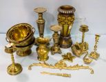 1147 Small Brass Planters, Letter Opener, Candlesticks, Duck, Pitcher, and Three Decorative Candleholders