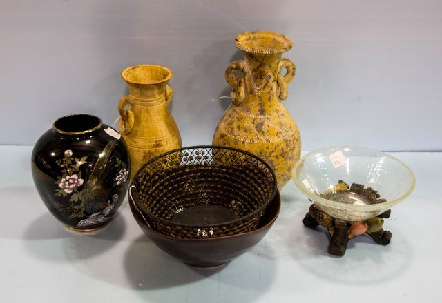 1197 Two Clay Jars, Bowls, and Black Oriental Vase