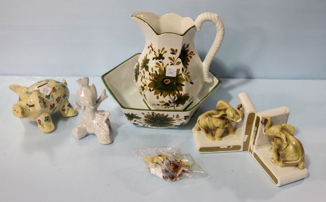 1227 Bowl and Pitcher Set, Piggy Bank, and Cracked Elephant Bookends