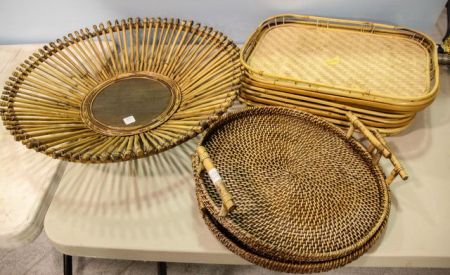 Five bamboo trays, large round tray and two matching rattan trays Five bamboo trays, large round tray and two matching rattan trays