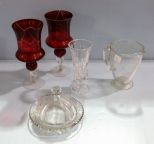Depression glass pitcher, depression glass butter dish, lead crystal vase & pair of red candle holders Depression glass pitcher, depression glass butter dish, lead crystal vase & pair of red candle holders