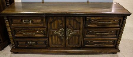Missing mirror, matches previous lot; 75" w., 20" d., 32" h. Missing mirror, matches previous lot; 75" w., 20" d., 32" h.