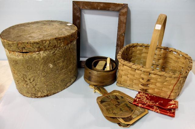 Victorian paper covered hat box, basket, five paper fans and antique frame 13 1/2" w., 18" h. Victorian paper covered hat box, basket, five paper fans and antique frame 13 1/2" w., 18" h.