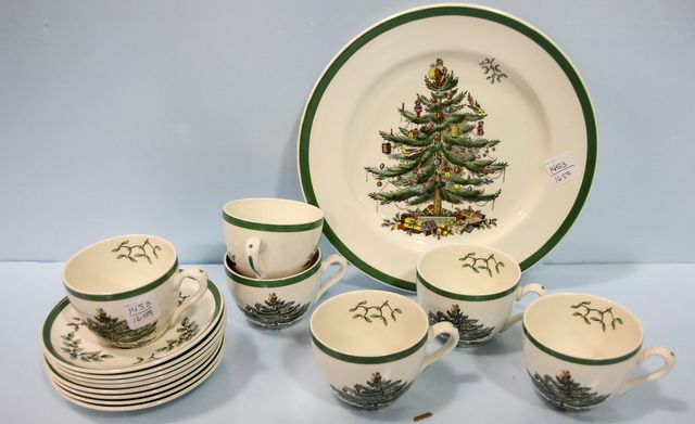 1453 Six Christmas Cups, Eight Saucers & Plate