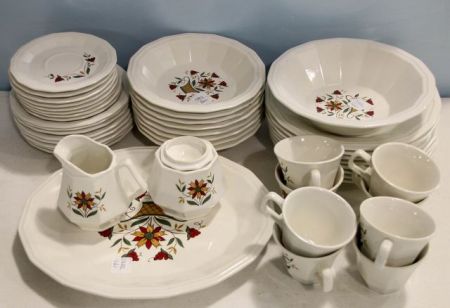 Eight dinner plates, eight salad plates, eight soup bowls, creamer, sugar, platter, eight cups, eight saucers and serving bowl Eight dinner plates, eight salad plates, eight soup bowls, creamer, sugar, platter, eight cups, eight saucers and serving bowl