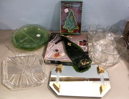 Four green divided depression glass plates, glass fruit set, mirror plateau and cheese dip dish Four green divided depression glass plates, glass fruit set, mirror plateau and cheese dip dish