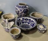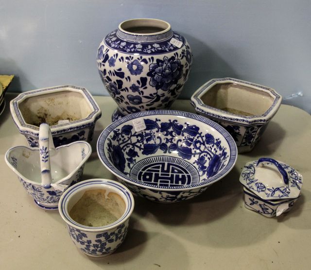 Blue and white porcelain vase, bowl, planters, basket and covered jar Blue and white porcelain vase, bowl, planters, basket and covered jar