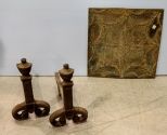 1539 Pair of Iron Andirons & Pressed Tin Panel