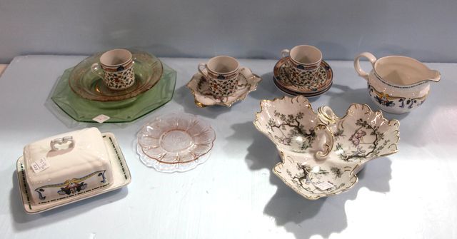 Three cups/saucers, three depression glass pieces, covered butter, pitcher and divided porcelain dish Three cups/saucers, three depression glass pieces, covered butter, pitcher and divided porcelain dish