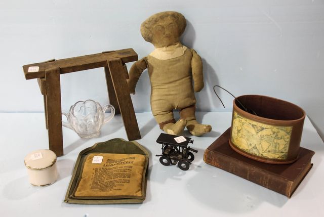 Miniature sawhorse, lighting pak, milk glass jar and book Miniature sawhorse, lighting pak, milk glass jar and book