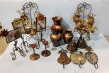 Three multicolored glass vases, metal candlesticks & three picture frames on stand Three multicolored glass vases, metal candlesticks & three picture frames on stand