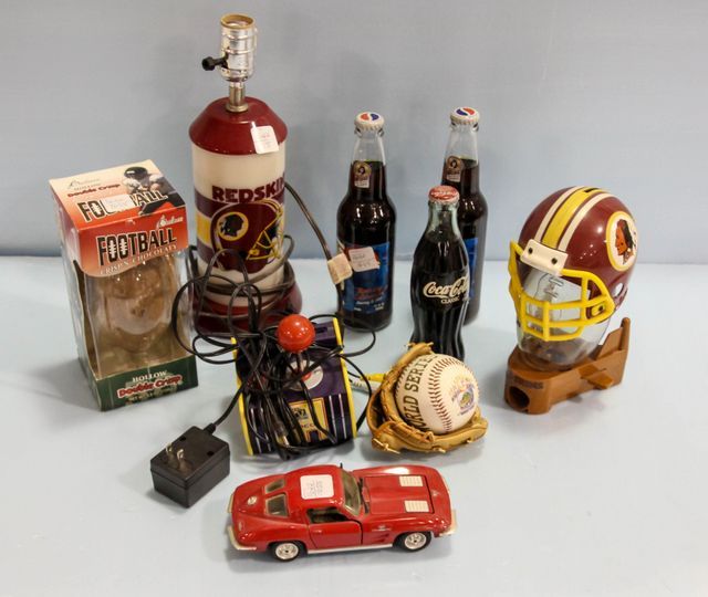 Consists of two 1999 birthday celebration bottles, Coke classic, Redskin lamp, miniature glove and ball, chocolate baseball and Redskin bank Consists of two 1999 birthday celebration bottles, Coke classic, Redskin lamp, miniature glove and ball, chocolate baseball and Redskin bank