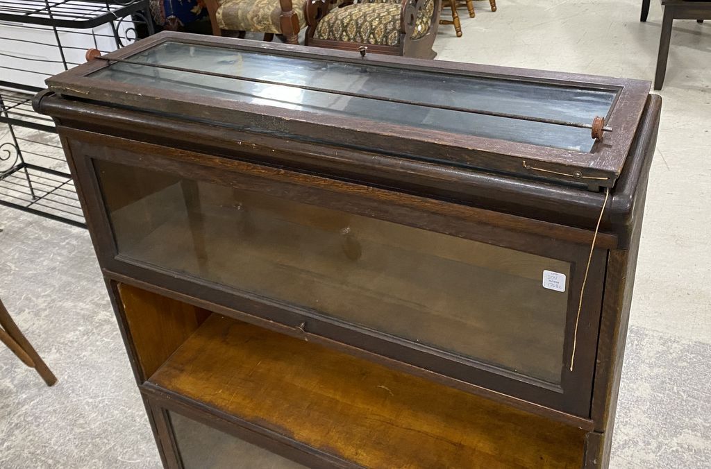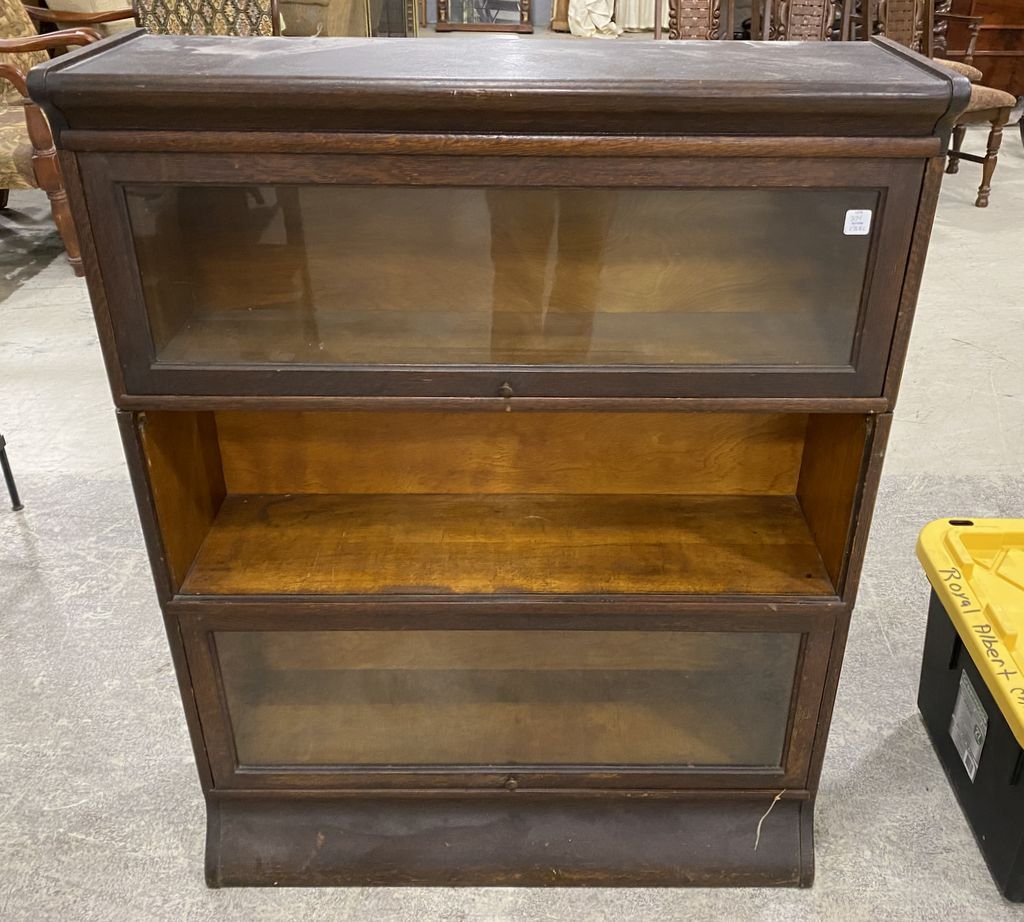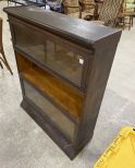 Vintage Oak Barrister Bookcase, three stack, three glass doors, one needs repairs, has wear and scratches, 43"h., 34"w., 10"d. Vintage Oak Barrister Bookcase, three stack, three glass doors, one needs repairs, has wear and scratches, 43"h., 34"w., 10"d.