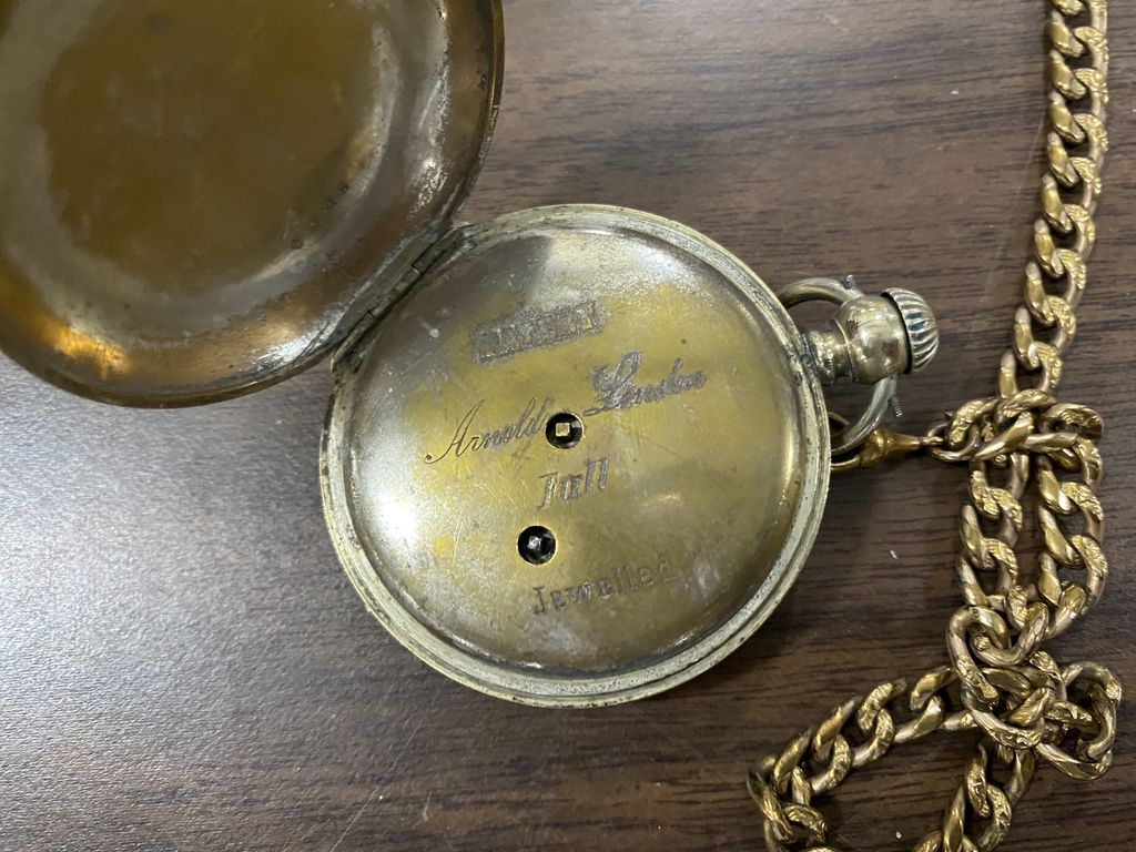 Arnold London Jeweled Size 18 Pocket Watch. With 20 year EMCO watch fob with key. does run. Arnold London Jeweled Size 18 Pocket Watch. With 20 year EMCO watch fob with key. does run.