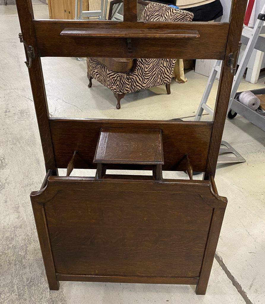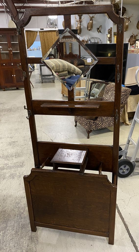 Mark Rowe & Sons Oak Hall Tree, beveled mirror, 6 coat hooks, umbrella slots missing pans, 72"h., 30"w. Mark Rowe & Sons Oak Hall Tree, beveled mirror, 6 coat hooks, umbrella slots missing pans, 72"h., 30"w.