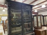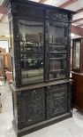 19th French Bookcase, very heavily carved ebonized oak with the original wavy glass, carved birds, florals, figures, wood shelves, two piece 100"h., 56"w., 18"d. 19th French Bookcase, very heavily carved ebonized oak with the original wavy glass, carved birds, florals, figures, wood shelves, two piece 100"h., 56"w., 18"d.