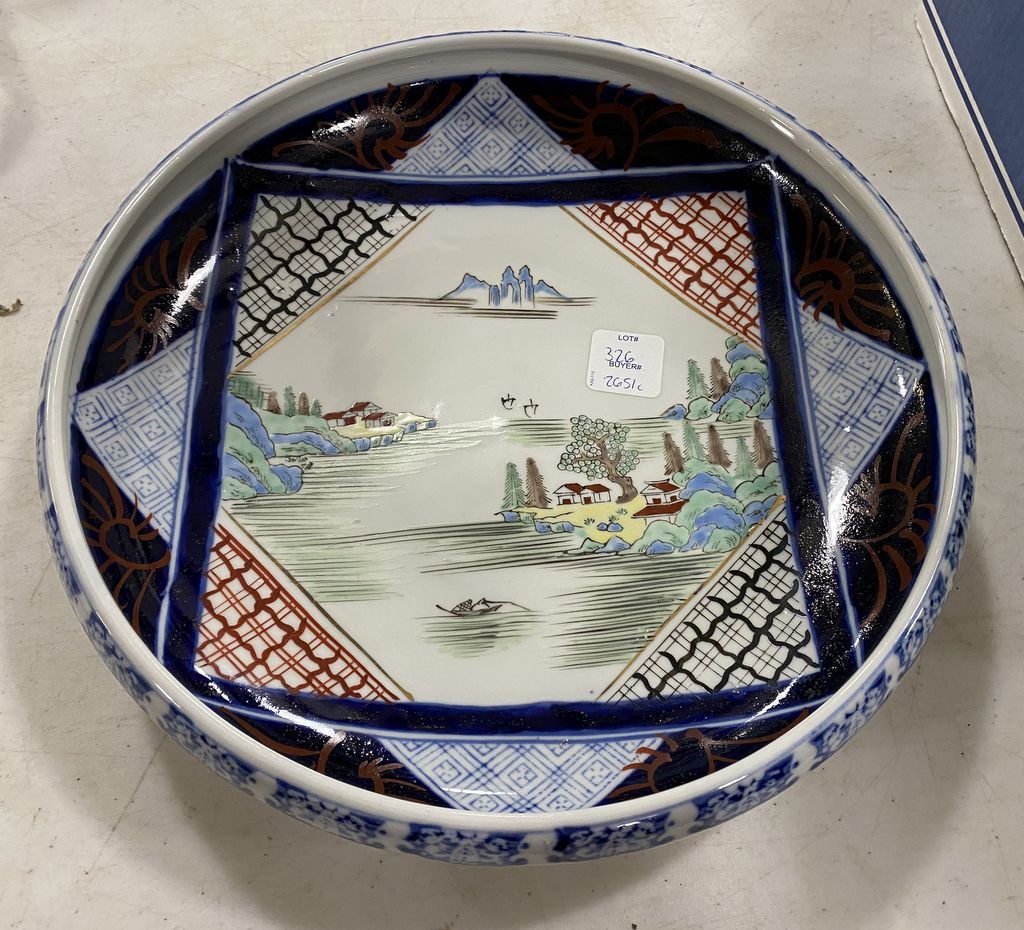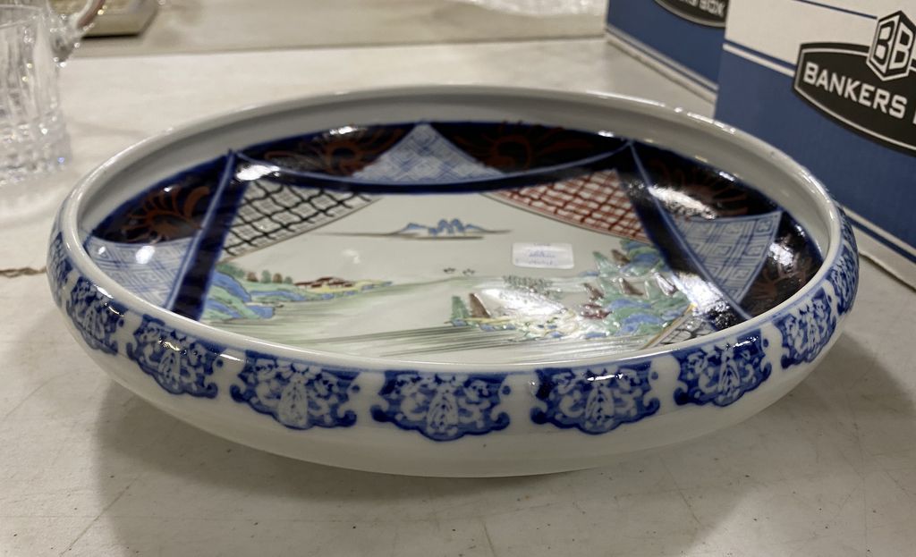 Oriental Style hand painted bowl, signed, 2 1/2"h., 11"dia. Oriental Style hand painted bowl, signed, 2 1/2"h., 11"dia.