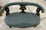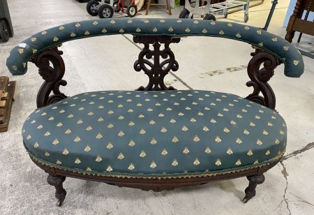 Antique Victorian Mahogany Settee, on casters, carved, fabric,, 28"h., 53"w. Antique Victorian Mahogany Settee, on casters, carved, fabric,, 28"h., 53"w.