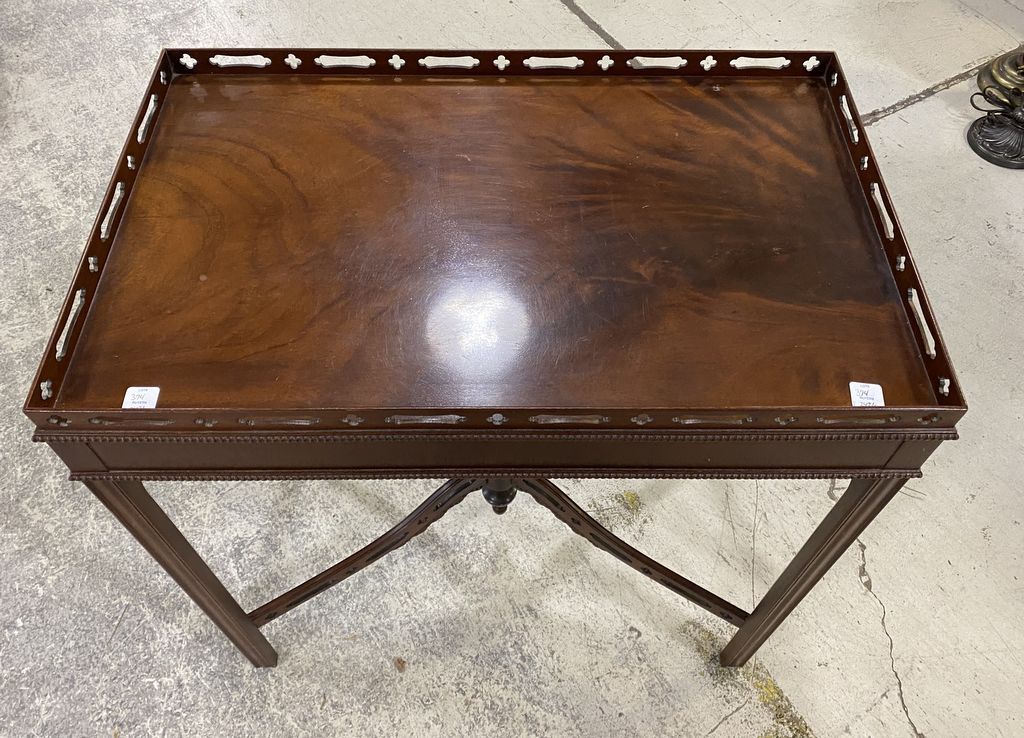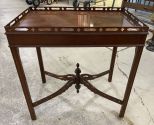 Baker Furniture Mahogany Side Table, Reproduction, gallery border, burl finish, 29"h., 28'w. Baker Furniture Mahogany Side Table, Reproduction, gallery border, burl finish, 29"h., 28'w.