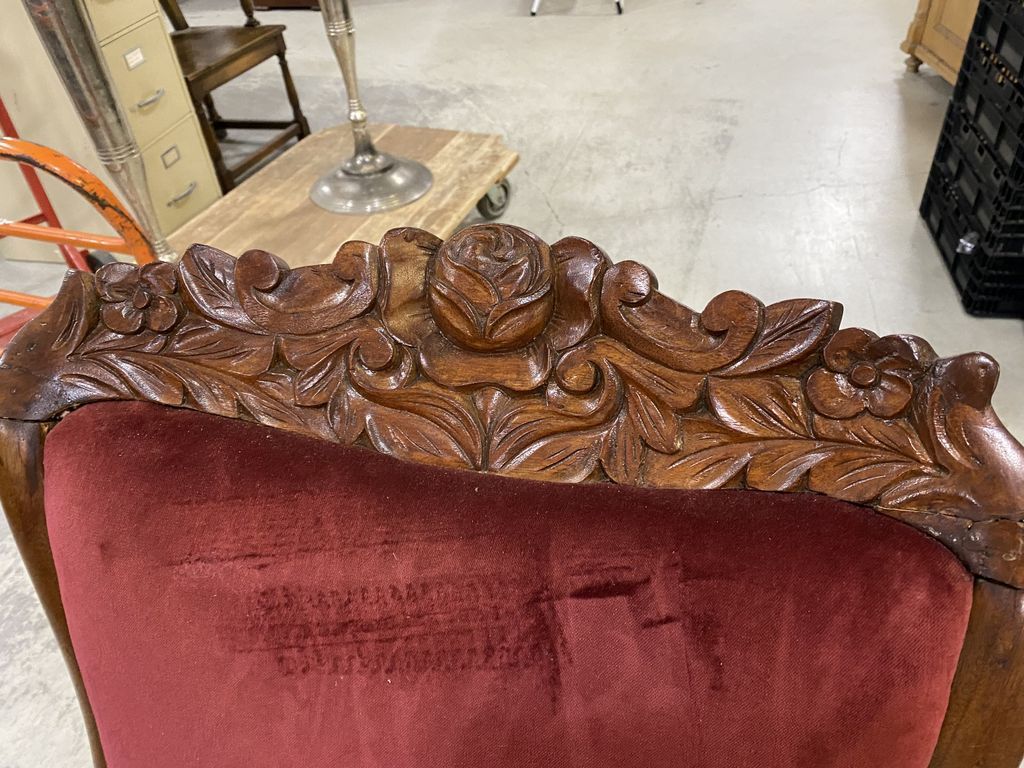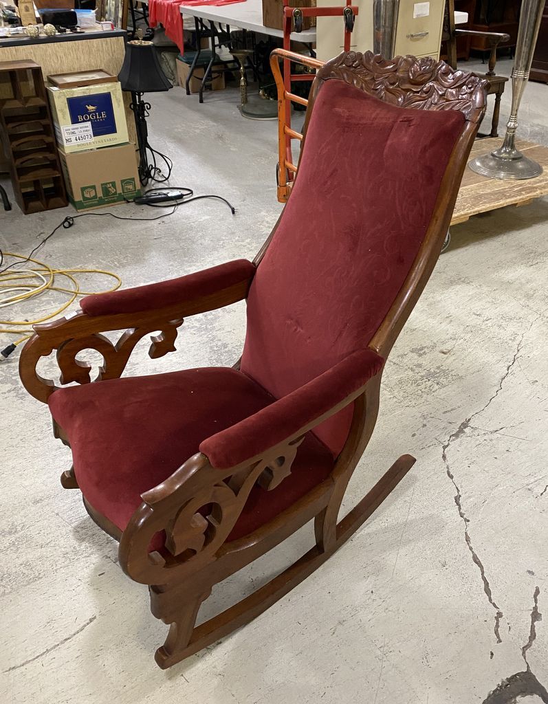 Victorian Style Mahogany Rocker, Red upholstery, carved crest. Victorian Style Mahogany Rocker, Red upholstery, carved crest.