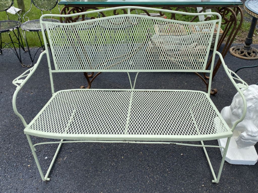 Green Painted Wrought Iron Bench, arms, diamond mesh designs. Green Painted Wrought Iron Bench, arms, diamond mesh designs.