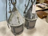 Pair of Antique Brass House Lanterns, painted, converted electric, used condition, glass shades, 26"h. Pair of Antique Brass House Lanterns, painted, converted electric, used condition, glass shades, 26"h.