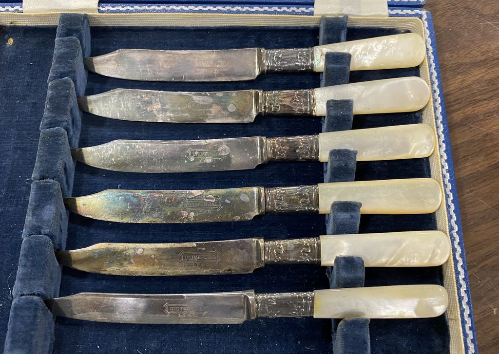 Set of Universal LF. & C Mother of Pearl Knife Set. 6 total. sterling banded. in case. Set of Universal LF. & C Mother of Pearl Knife Set. 6 total. sterling banded. in case.