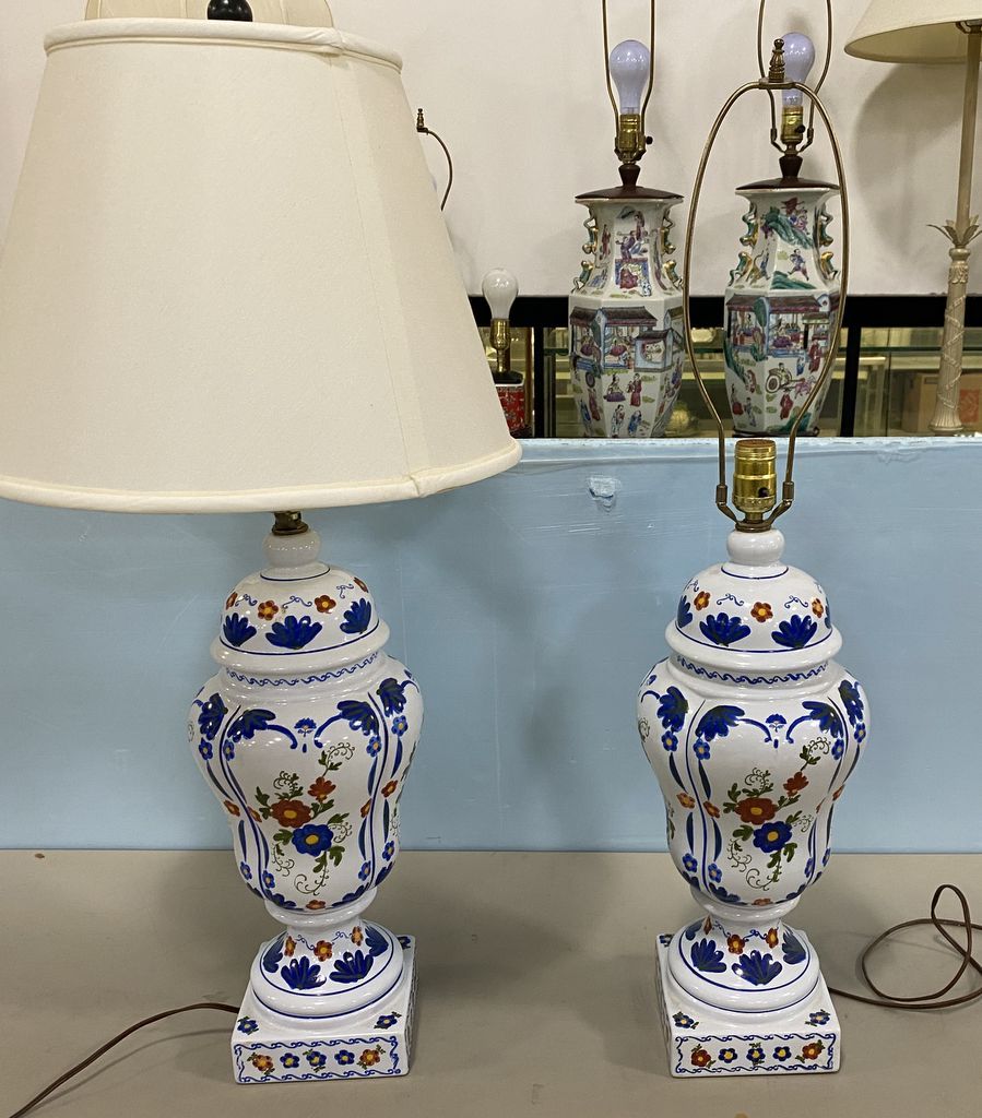564 Pair of Hand Painted Blue & White Floral Table Lamps