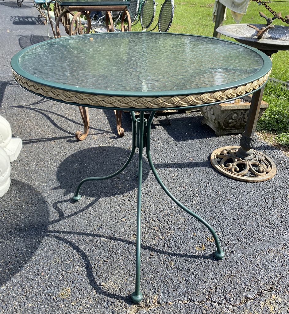 Metal and Glass Top Patio Table, woven border design. Metal and Glass Top Patio Table, woven border design.