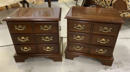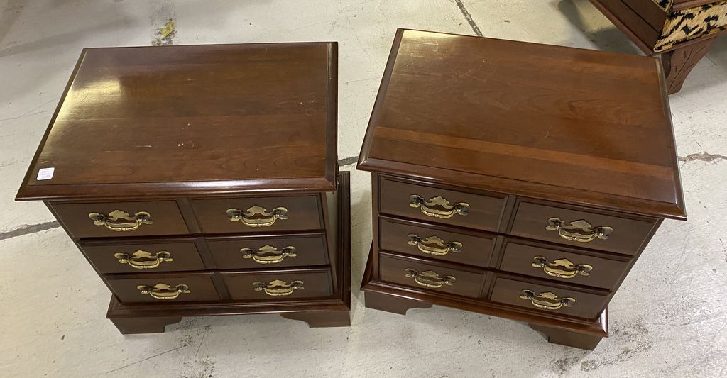 Pair of Cherry Early American Style Night Stands, three drawers, brass pulls, good condition, 21"h., 16"w., 22"d. Pair of Cherry Early American Style Night Stands, three drawers, brass pulls, good condition, 21"h., 16"w., 22"d.