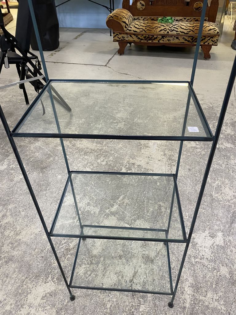 Painted Wrought Iron Display Stand, four glass shelves, 77"h., 21"w. Painted Wrought Iron Display Stand, four glass shelves, 77"h., 21"w.